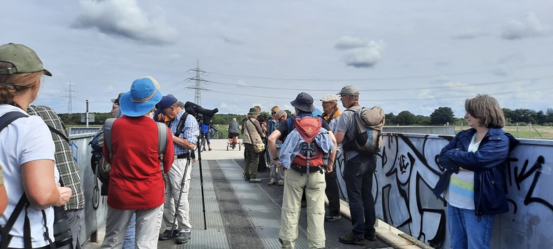 Unsere Exkursion startete am Emscherhof und ging entlang der Renaturierungsflächen bis zum Rhein, dann auf die südliche Emscherseite und durch die Rheinaue Walsum und schließlich zurück zum Emscherhof. Hier kehrten wir ein, so dass wir uns mit Kaffee und Kuchen bei Fachgesprächen vor der Abreise stärken konnten. Insgesamt waren wir etwas 40 Teilnehmende. Für Fragen zu allen NWO-Themen standen auch der Vorstand und die Geschäftsstelle zur Verfügung. Neben Informationen und Austausch kam auch die Vogelbeobachtung nicht zu kurz: Zu den Highlights gehörten Kiebitze und Flussuferläufer, überfliegende Wespenbussarde, Schnatterenten, Eisvogel und vor allem ein kreisender Seeadler. Gleich zu Beginn wurde ein Rotohrbülbül beobachtet. Diese südostasiatische Art war allerdings aus einem Zoo entwichen. Insgesamt wurden 52 Arten festgestellt.